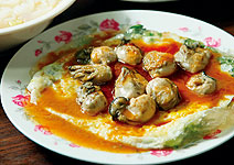 勝味另有一絕,為蚵仔煎。更正確的潮汕叫法,是「蠔餅」,與我們本地貫見的蚵仔煎頗不同。一盤煎起,端上桌,像一張蔥油餅,以筷子戳開,夾起一片,裏面有蚵、有蛋、有粉溶解的餅、還有脆爽可口的綠葉菜如大陸妹,很是可口,也不特別結實撐腹。