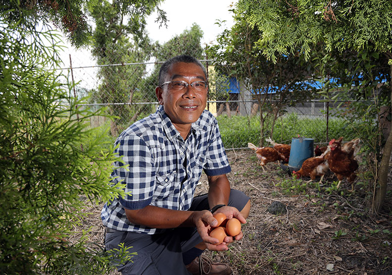 「我每平方公尺只養八到九隻雞,高於人道飼養標準,」他說,自己在2014年轉型,從15萬隻白肉雞,改養桂丁雞、烏骨雞和2000多隻蛋雞,自製草本植物飼料配方,安然度過禽流感和毒蛋事件。
